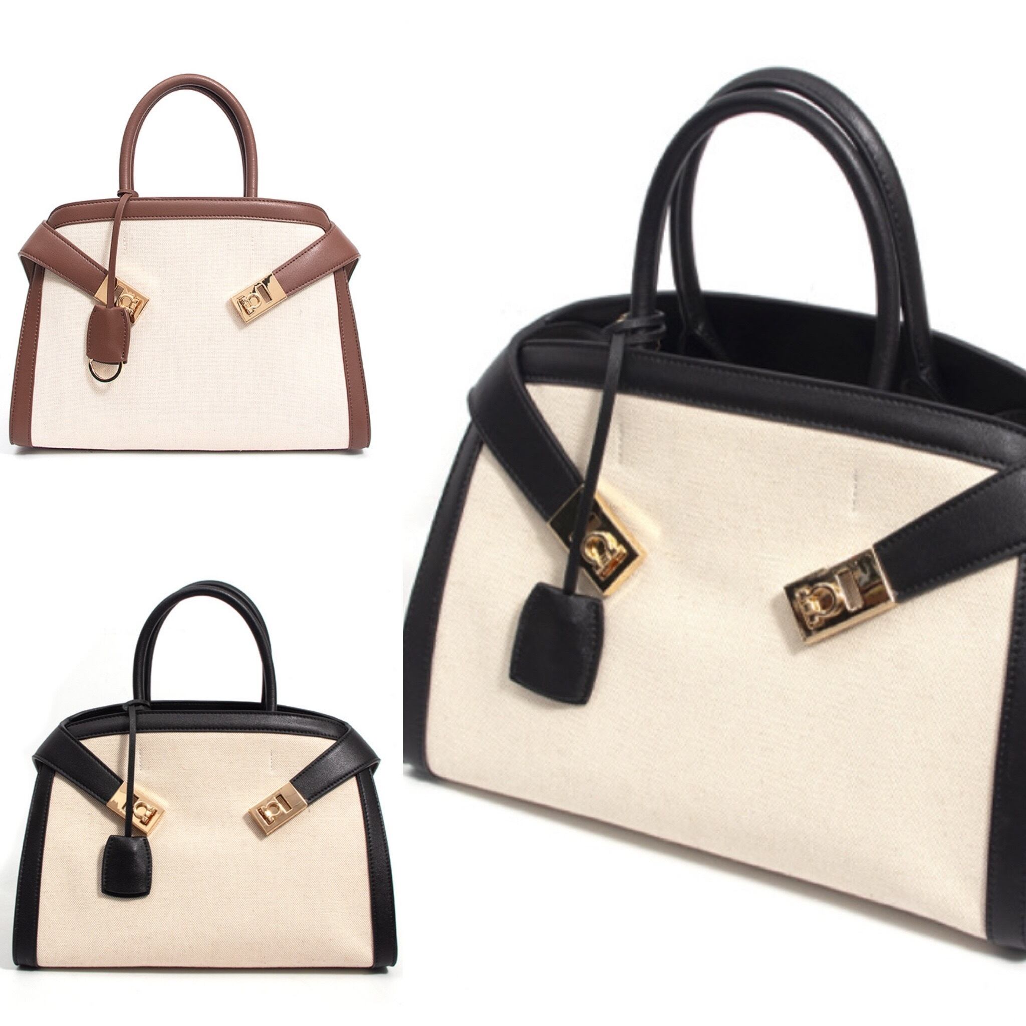 【予約販売】韓国デザイン レザー×キャンバス ハンドバッグ BAG ショルダー