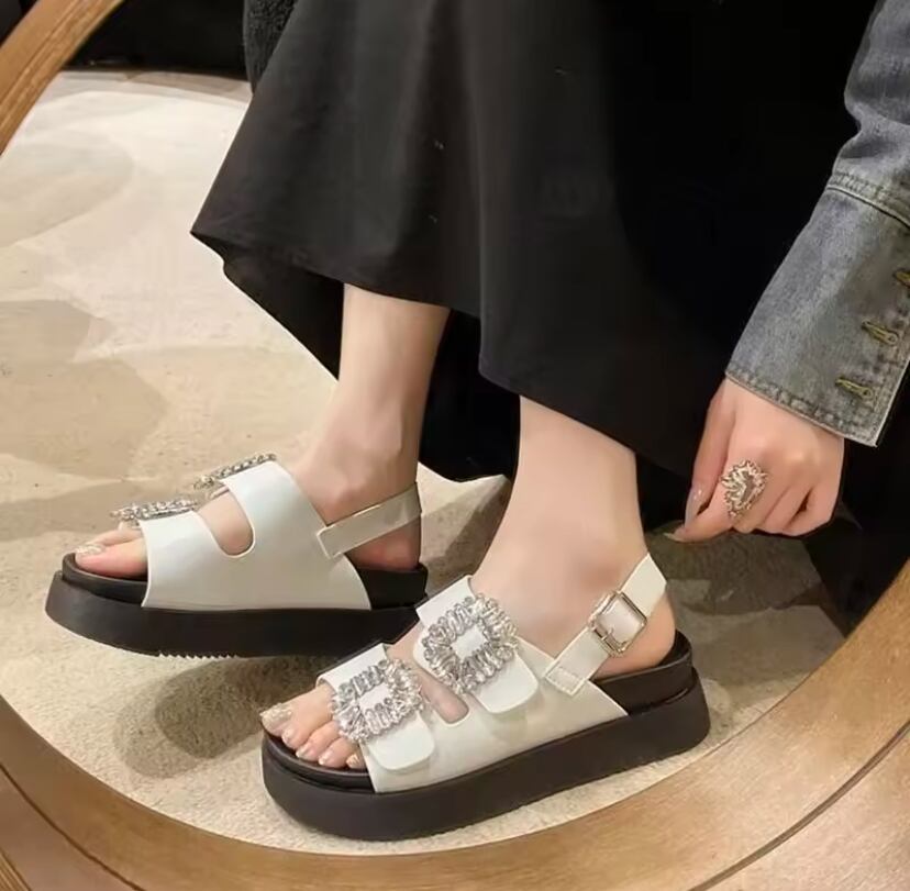 【予約販売】韓国デザイン ビジュー 厚底 バックルサンダル シューズ ヒール