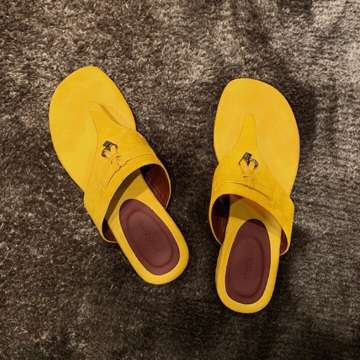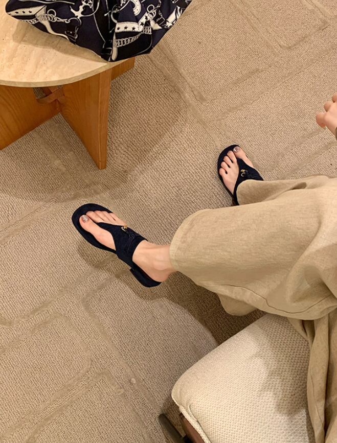 【予約販売】韓国デザイン 羊皮 フラットサンダル スエード チェーム付