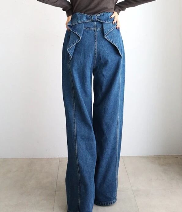 【予約販売】韓国デザイン ビッグリボン デニムパンツ ワイドジーンズ DENIM