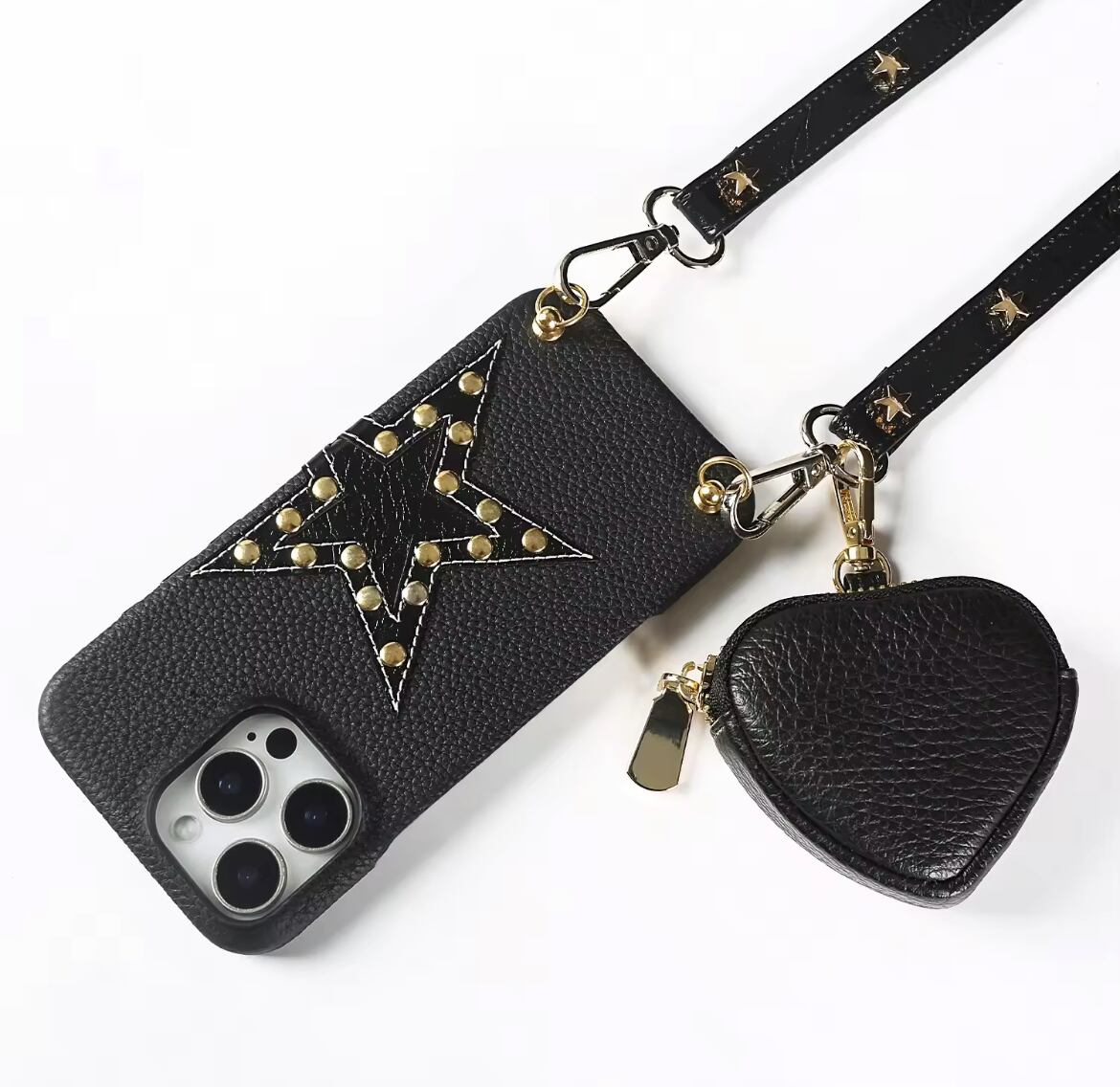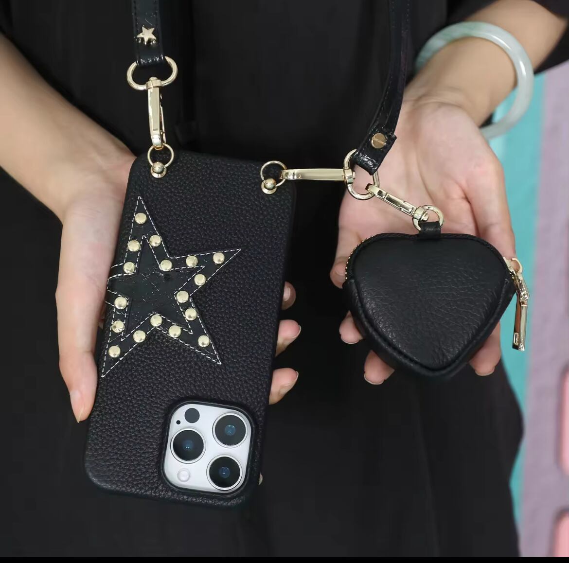 【予約販売】韓国デザイン 本革 レザーショルダーストラップ iphoneケース 星 STAR スター