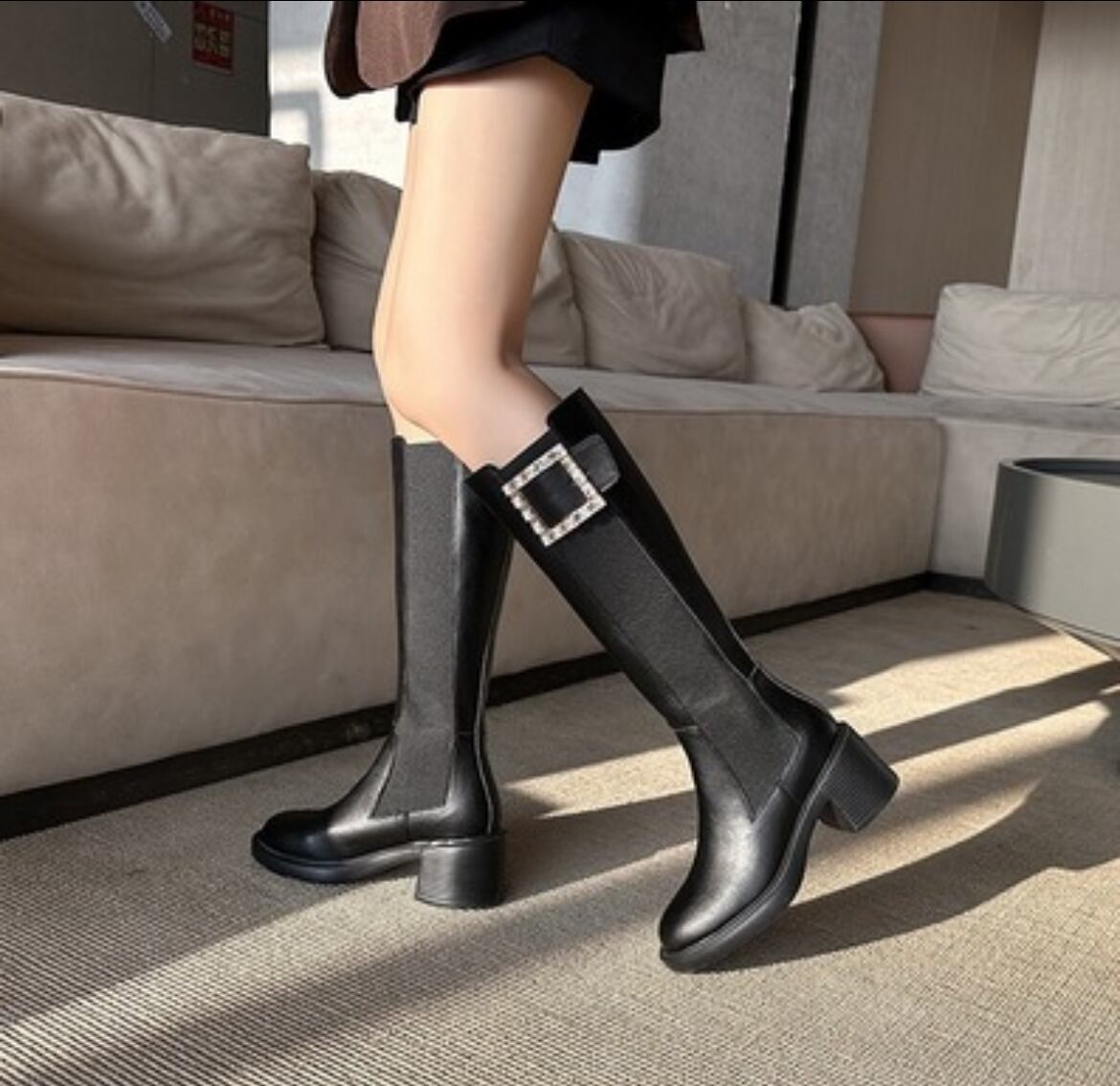 【予約販売】デザイン ビジューレザーロングブーツ チェルシー エンジニア