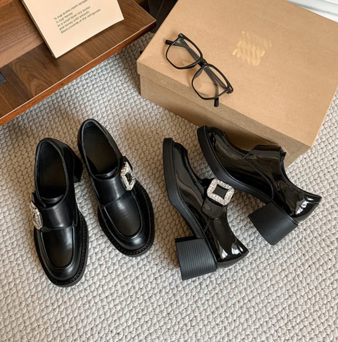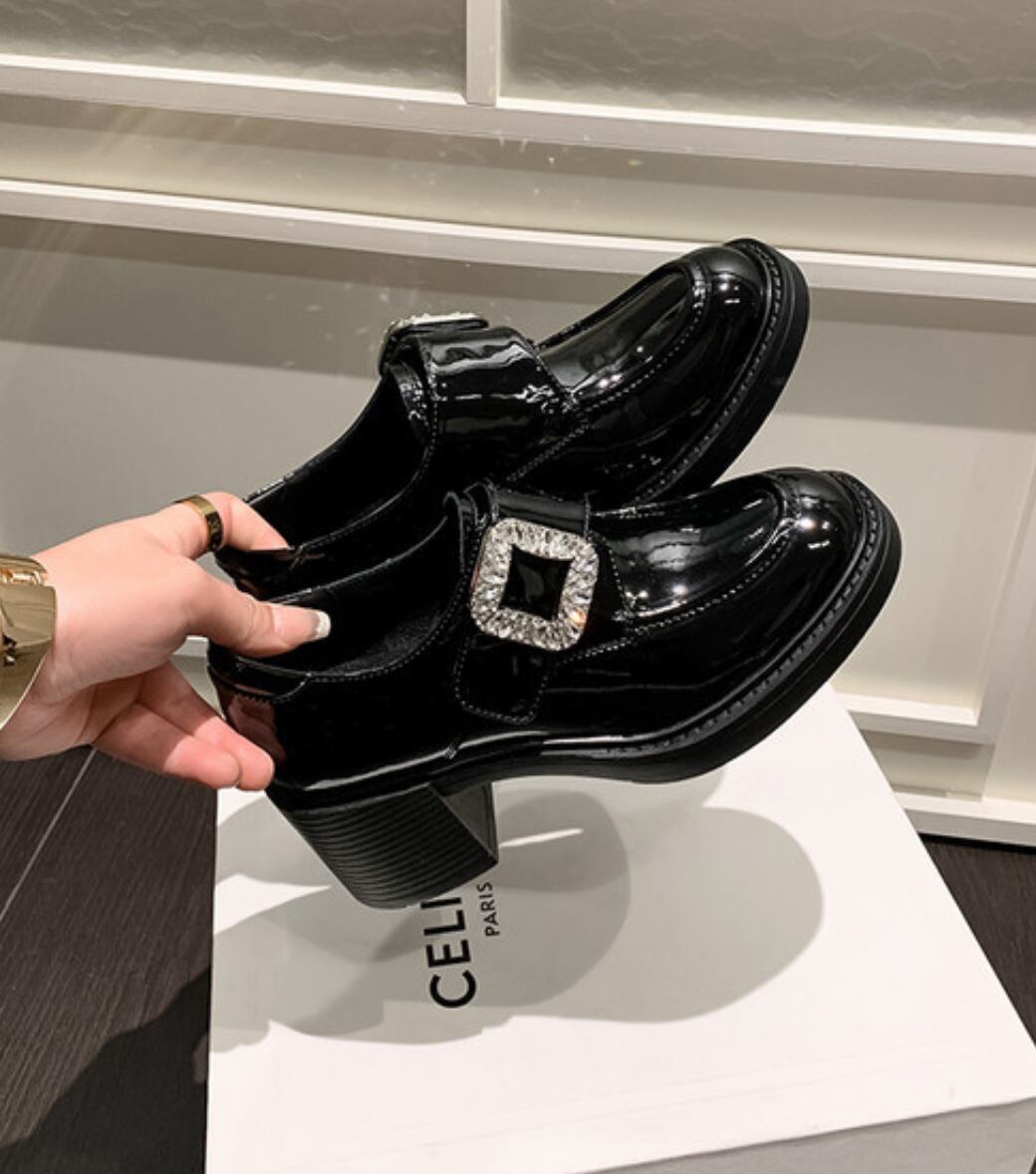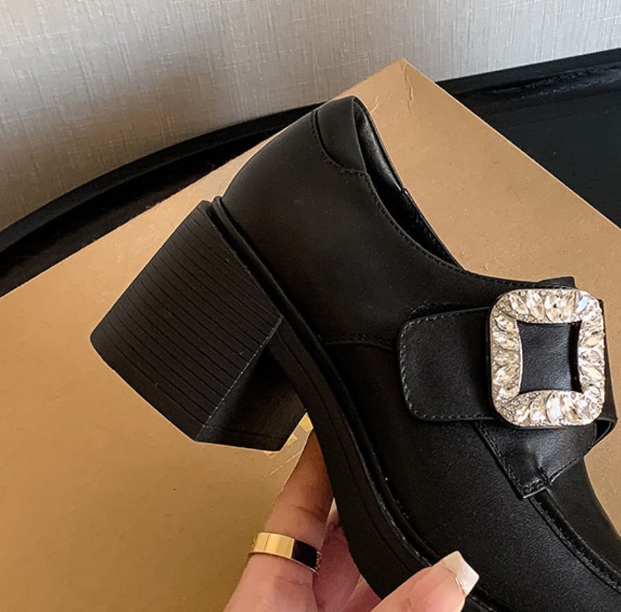 【予約販売】韓国デザイン 本革レザービジューローファー 厚底ヒールシューズ