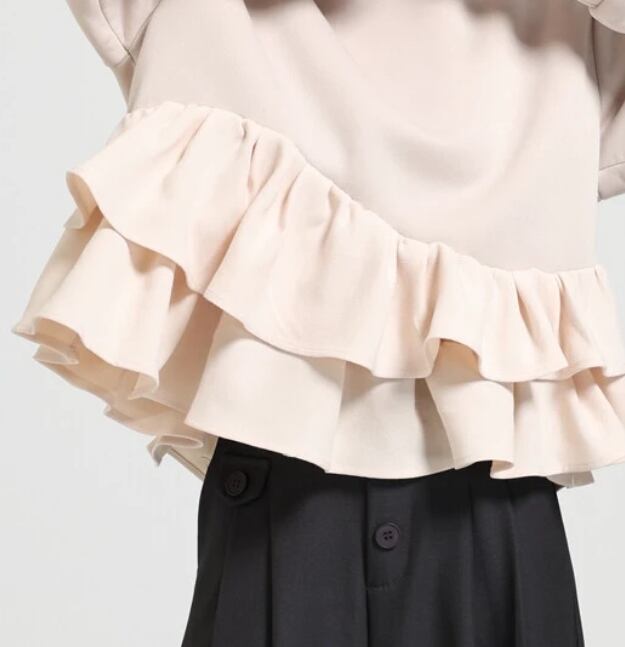 ウエストラインに重ねたダブルフリルが印象的なペプラムシルエットのプルオーバー。