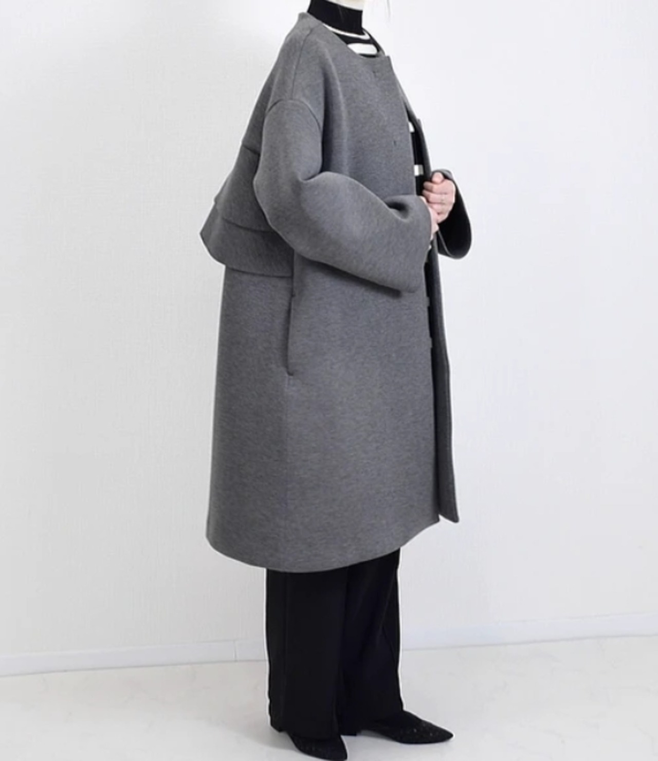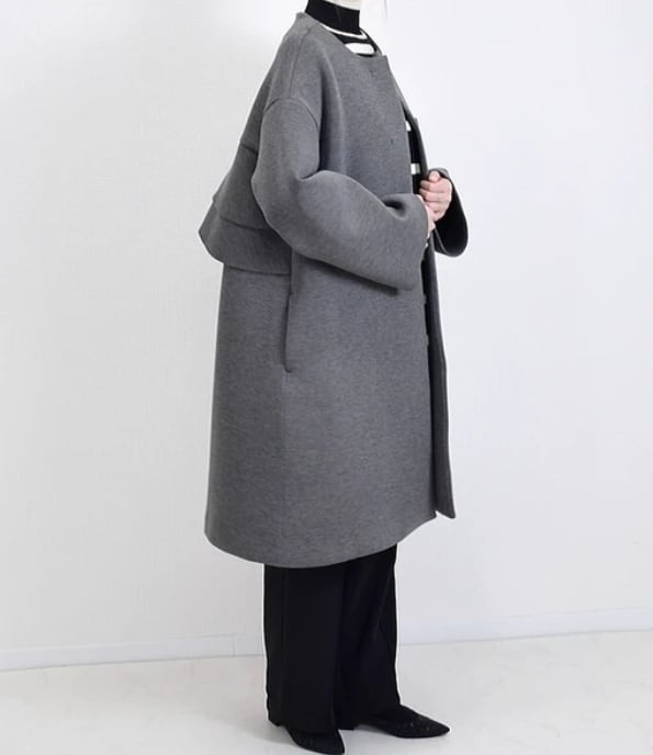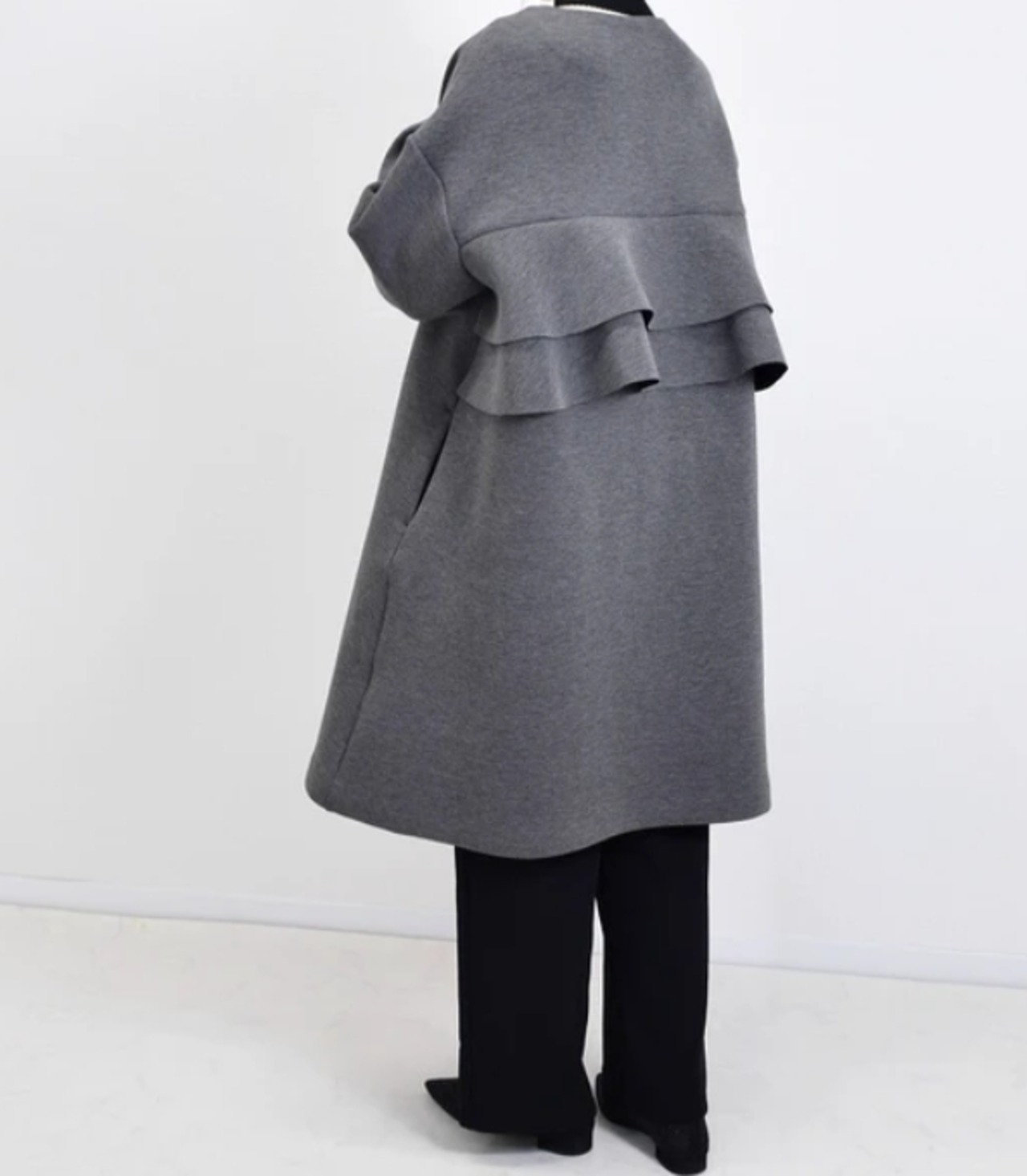 ふっくらとしたハリ感と軽やかさを兼ね備えた、ダンボールニット素材のバックフリルコート