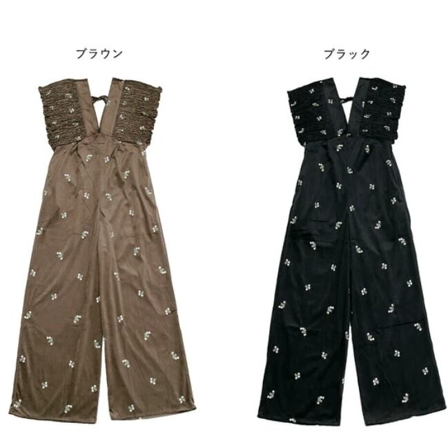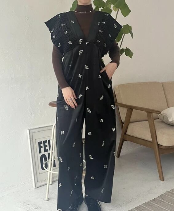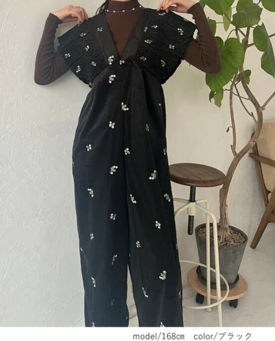 【予約販売】庫限り フラワー柄刺繍 シャーリングVネックサロペットパンツ