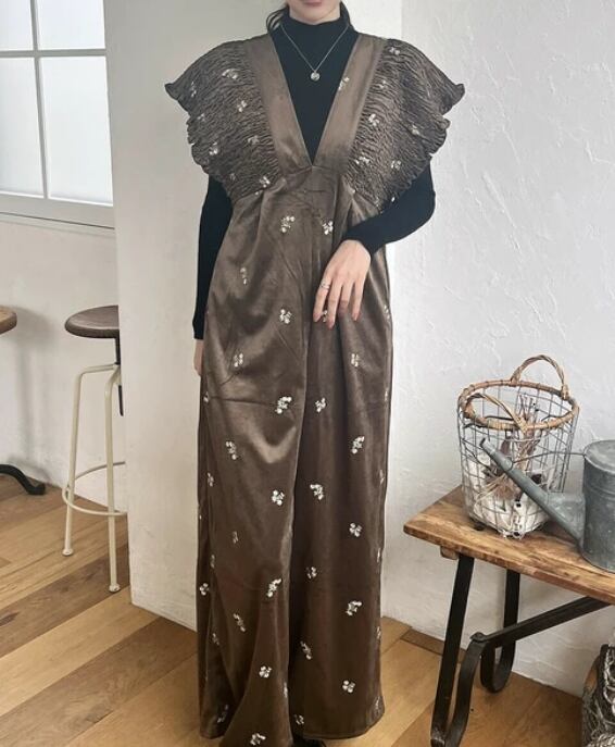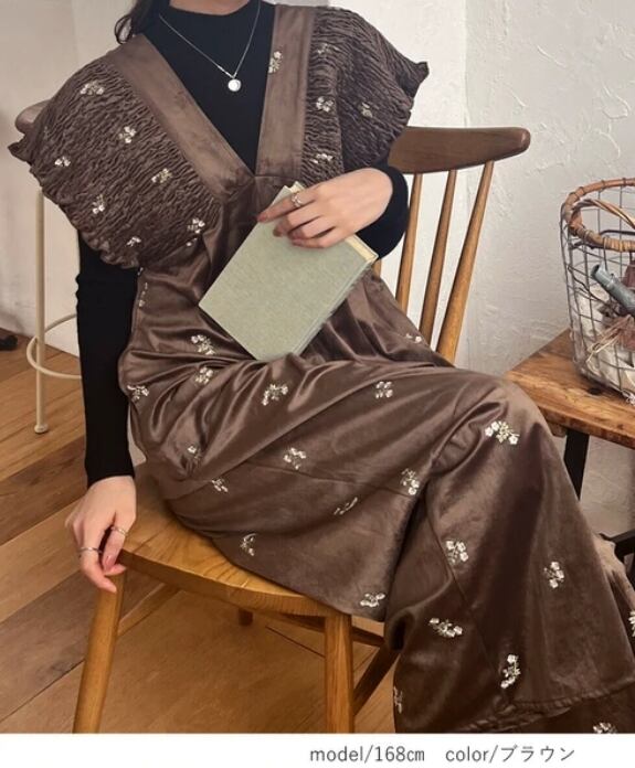 ベロア素材に施された繊細な刺繍が目を惹くシャーリングデザインVネックサロペット。