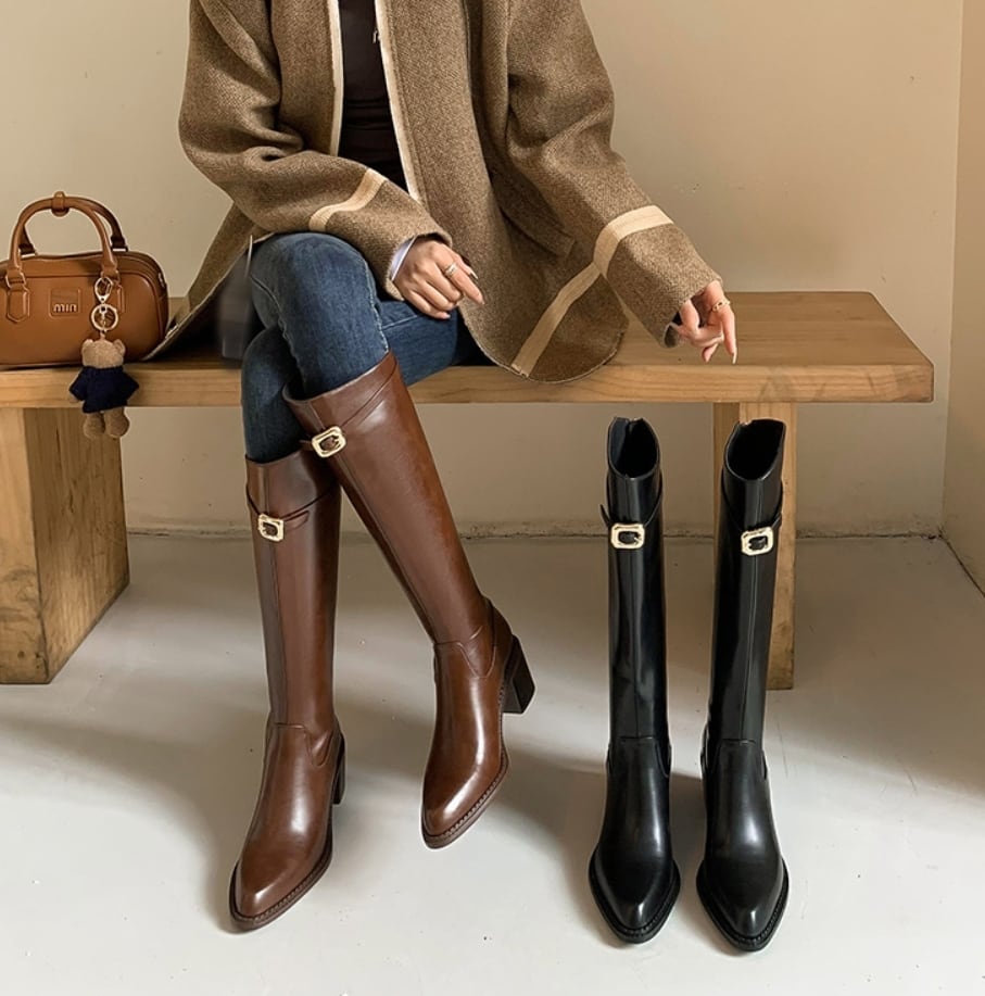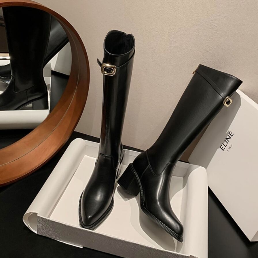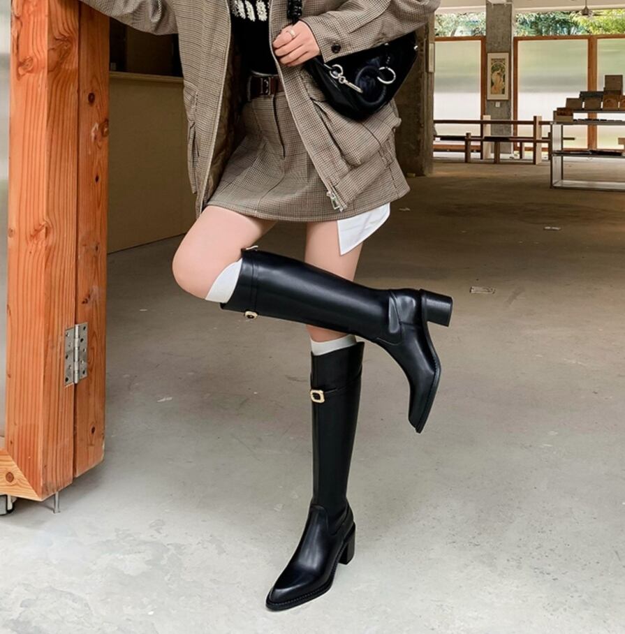 【予約販売】韓国デザイン 美脚 レザーロングベルトライダーブーツ 本革