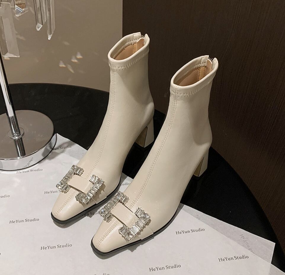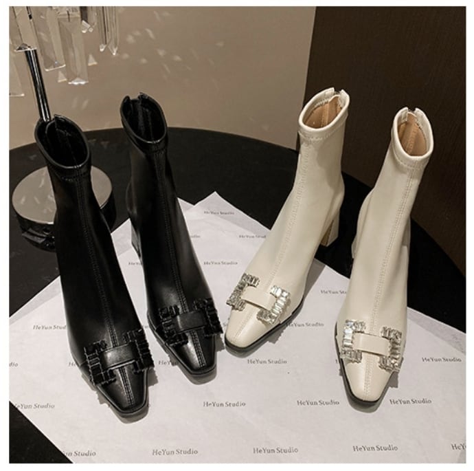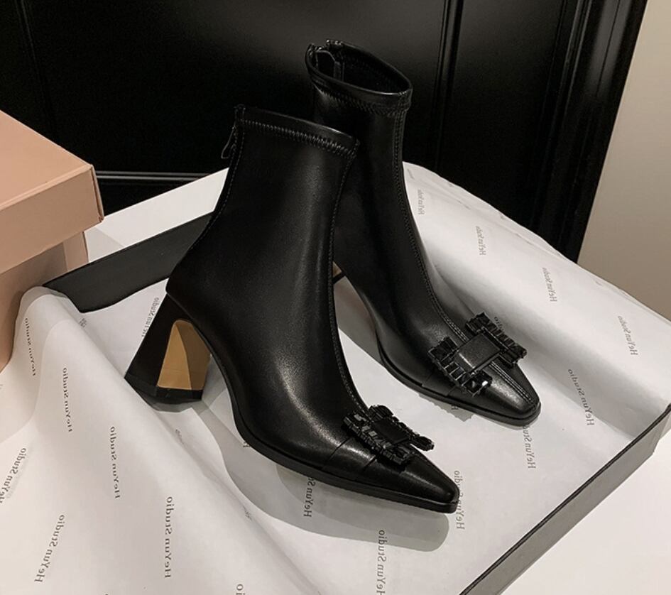 【予約販売】韓国デザイン 豚革 レザースクエアカットミディ ショートブーツ