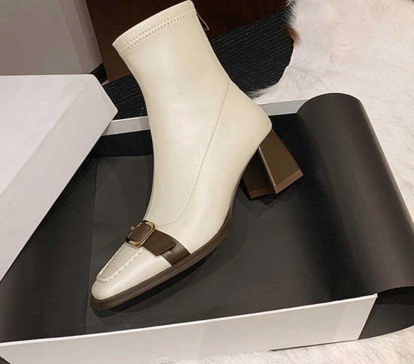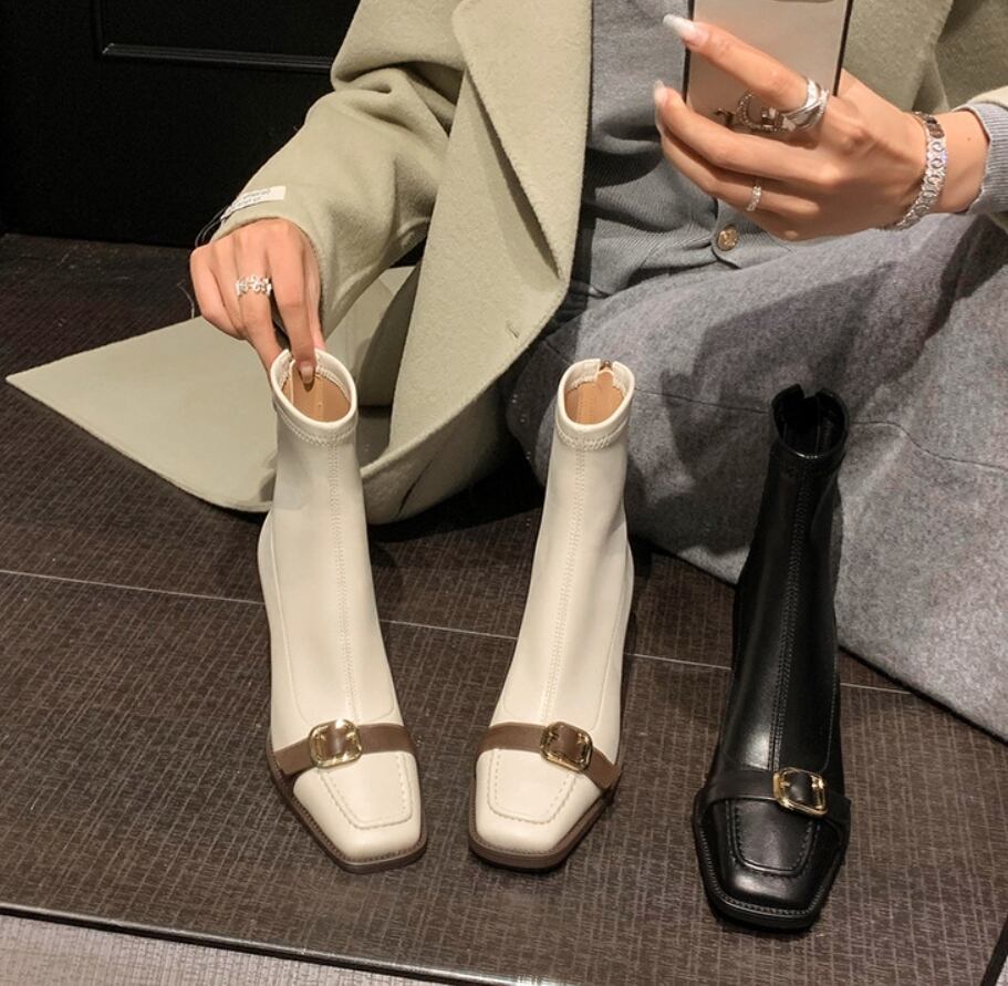 【予約販売】韓国デザイン 豚革 レザースクエアカットミディ ショートブーツ