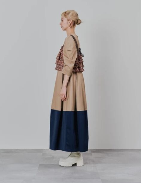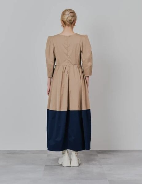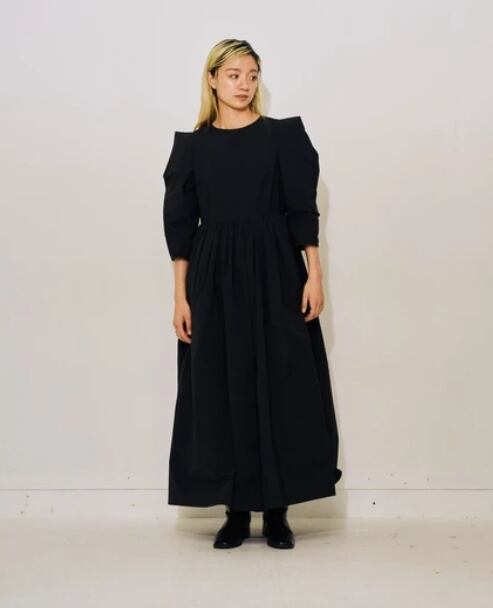 タフタの記憶する生地を活かしたショルダータックがポイント。ウエストで切り替えたギャザースカートが綺麗なシルエットを生み出します。