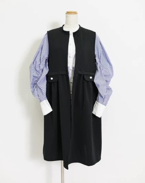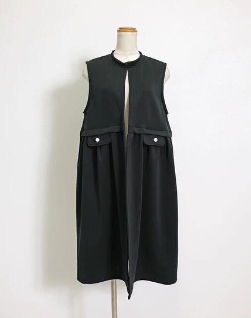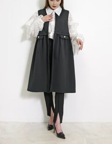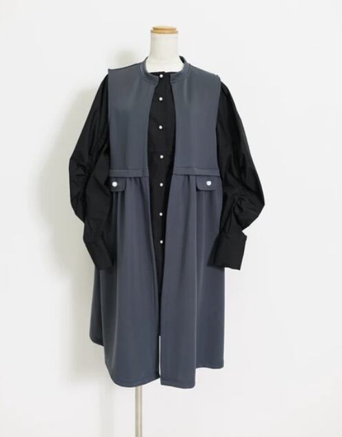 【予約販売】TPU薄手ポンチ ウエストギャザー切り替え パール釦ロングベスト