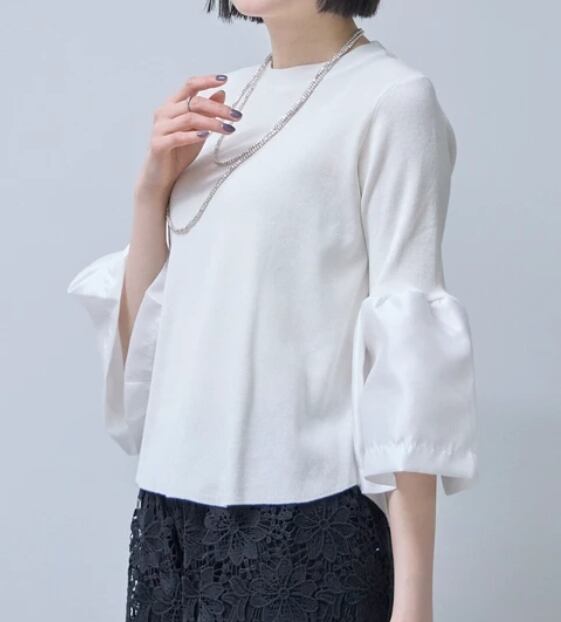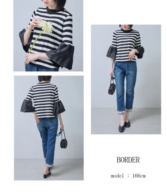 【予約販売】【2026SS】お袖布帛切替 七分袖ニット ボーダーラウンドトップス