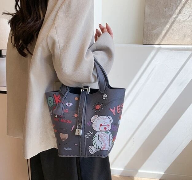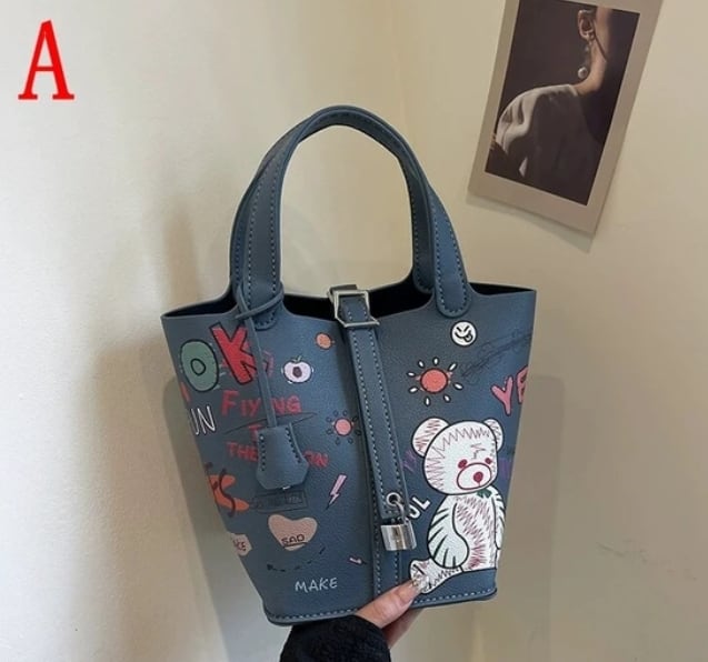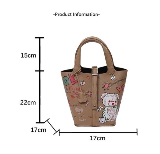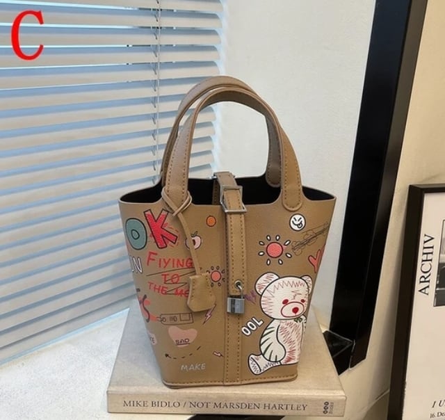 【予約販売】落書きハンドバッグ PUレザー キューブバッグ 巾着イラストBAG