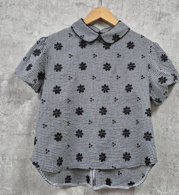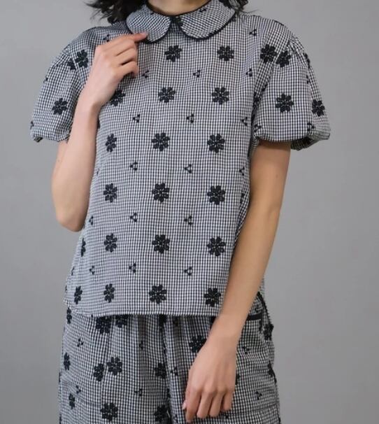 【予約販売】(2026SS)サッカー生地ギンガムチェック柄 フラワー刺繍ブラウス