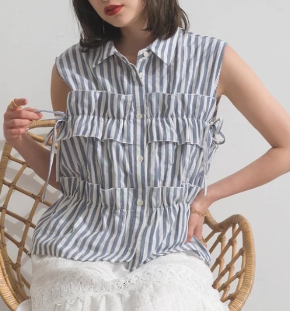 【予約販売】(2026SS)ストライプ ノースリ フロントフリルブラウス チュール